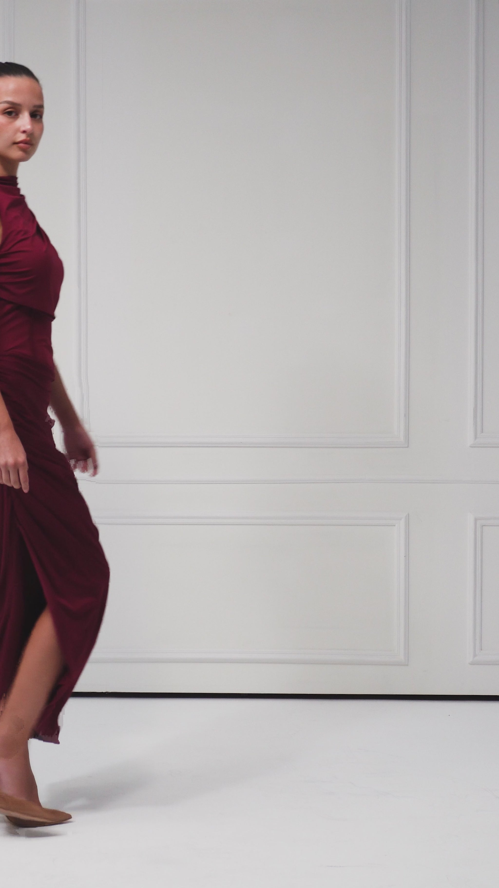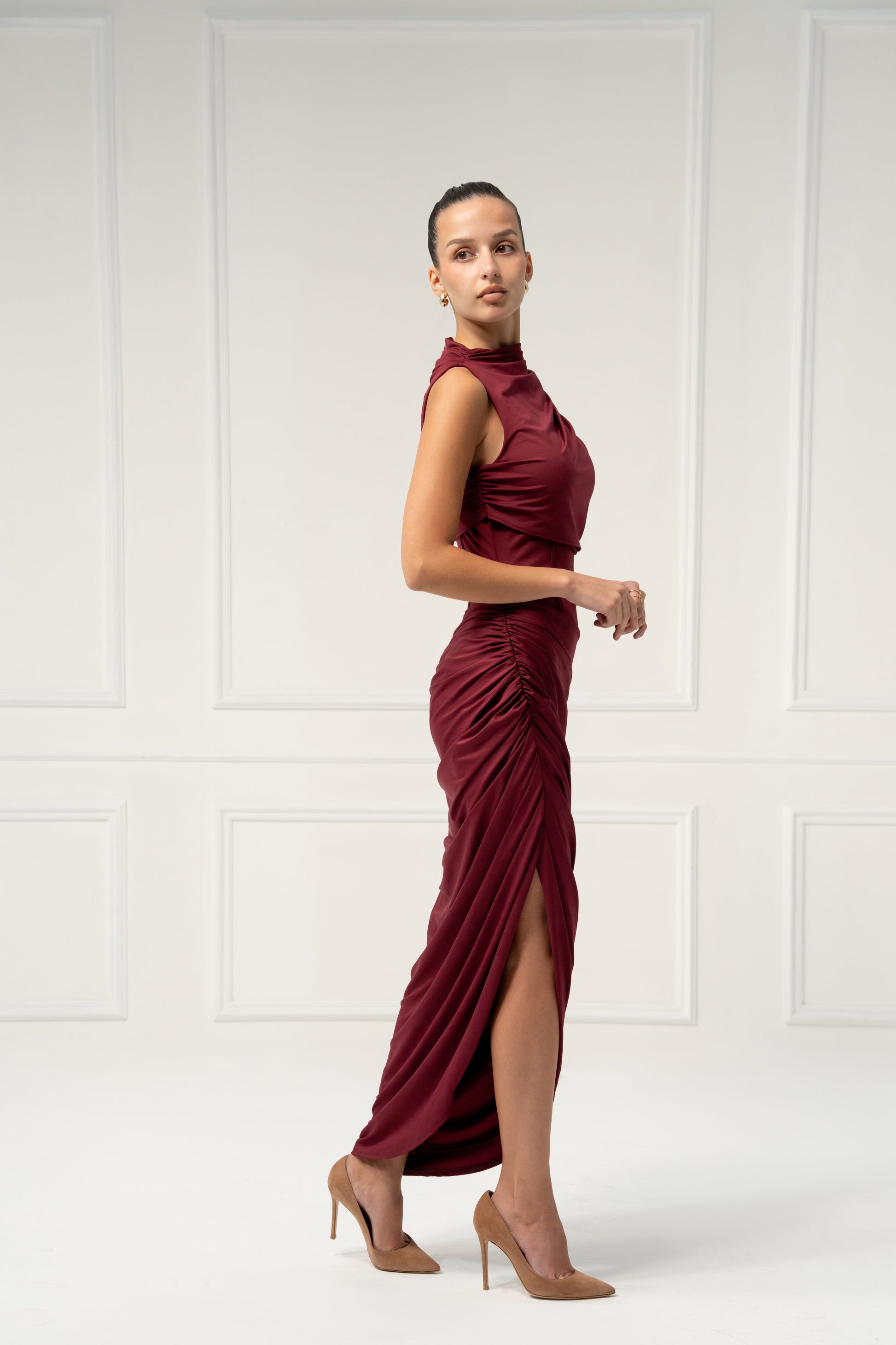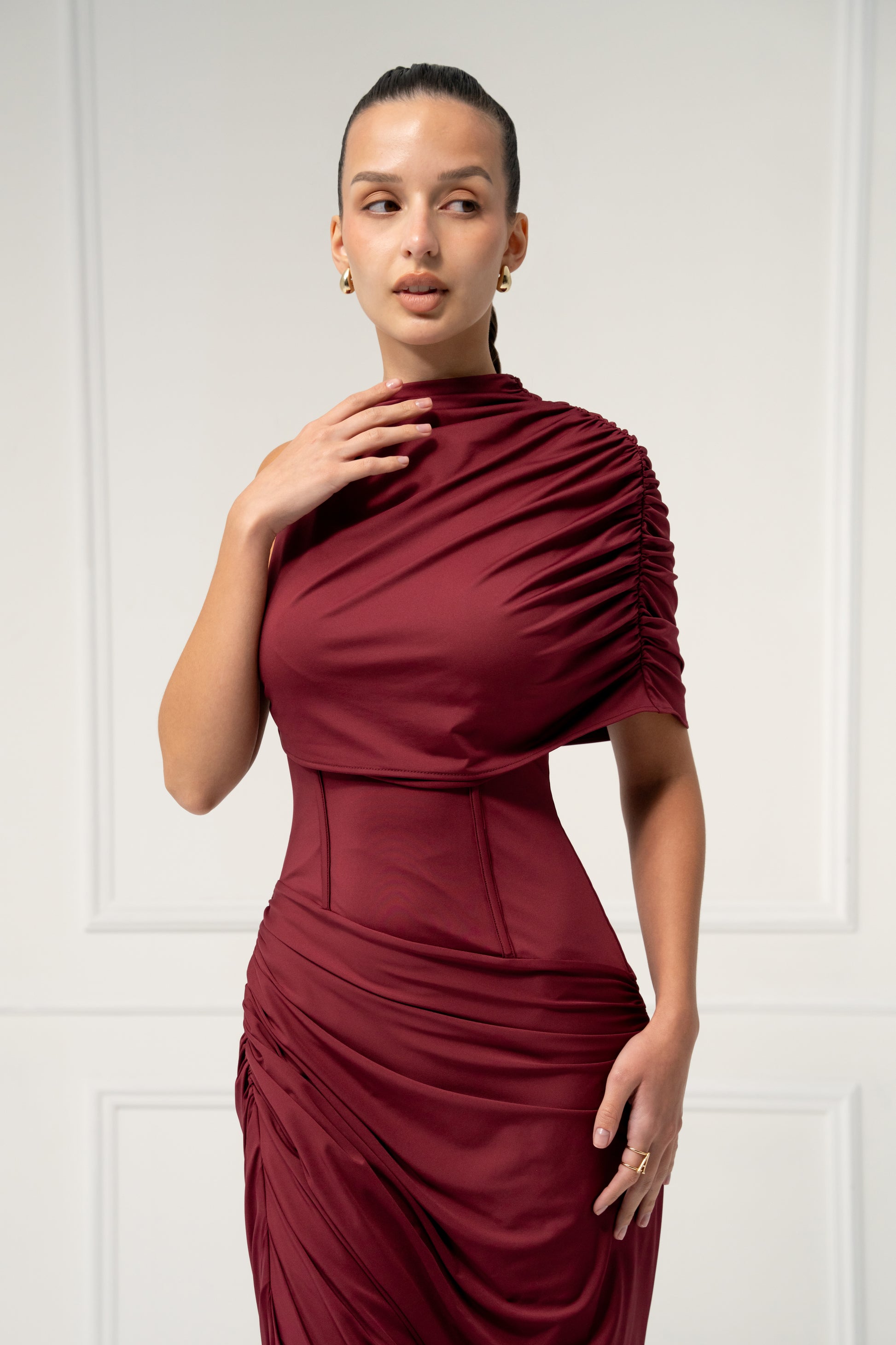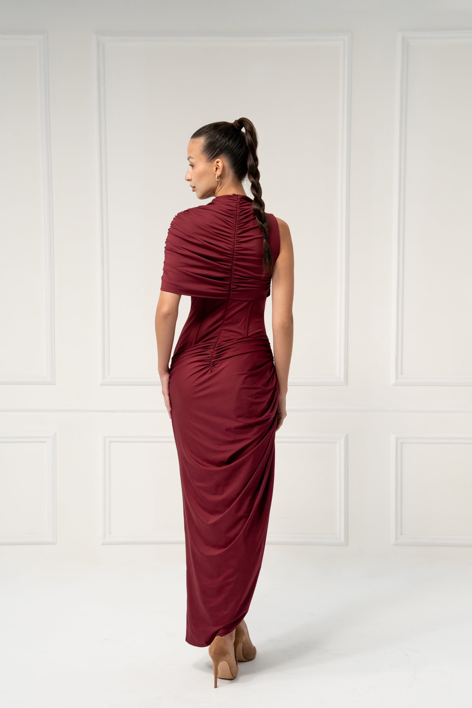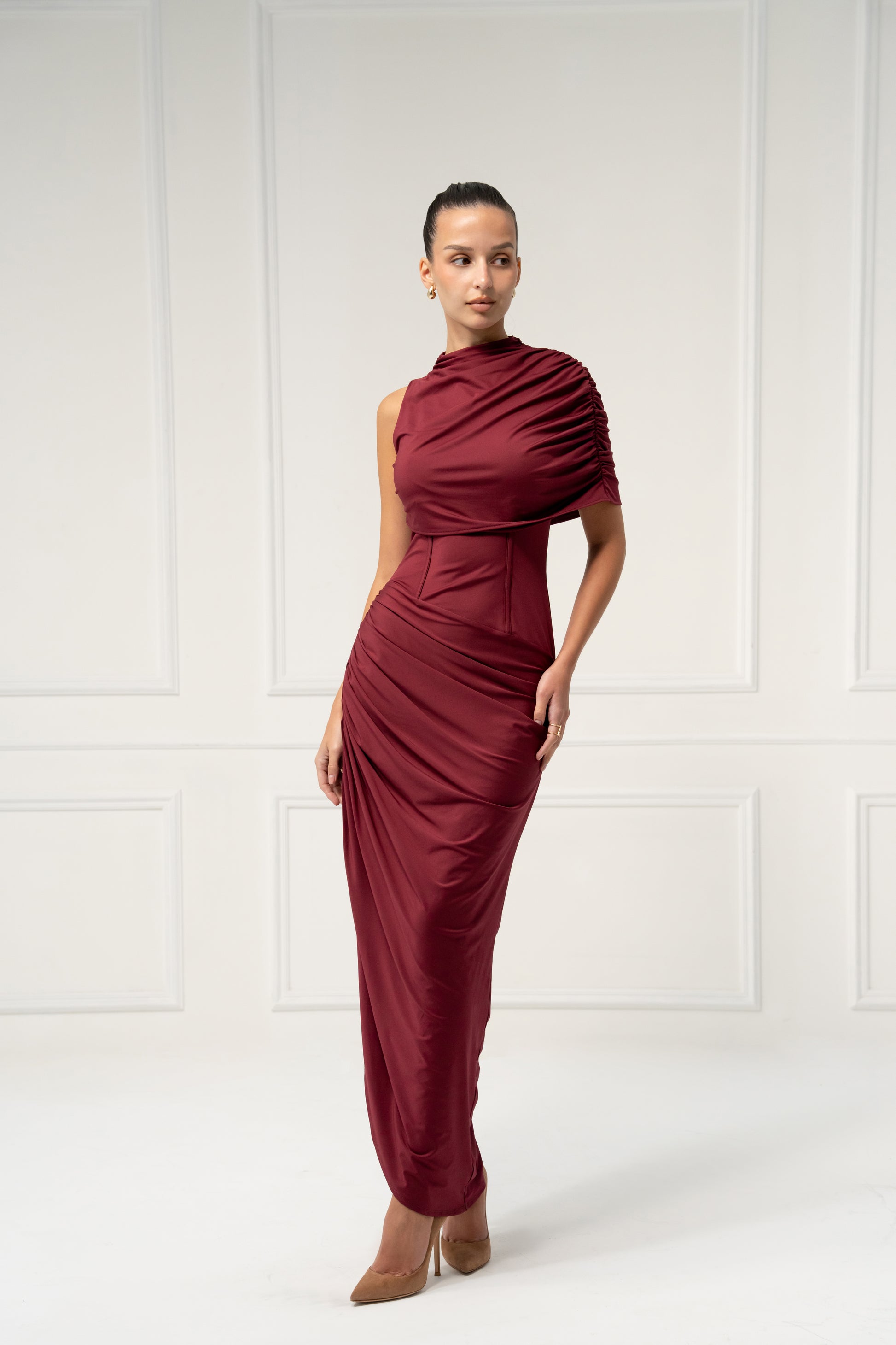 A masterpiece of sculptural draping, this one-shoulder gown embodies bold sophistication. The asymmetrical silhouette enhances the natural curves, while custom cascading pleats create movement and drama with every step. Designed for grand entrances and unforgettable moments, it’s the ultimate dress for evening glamour. Elevate the look with gold jewelry and sleek heels for a striking finish.